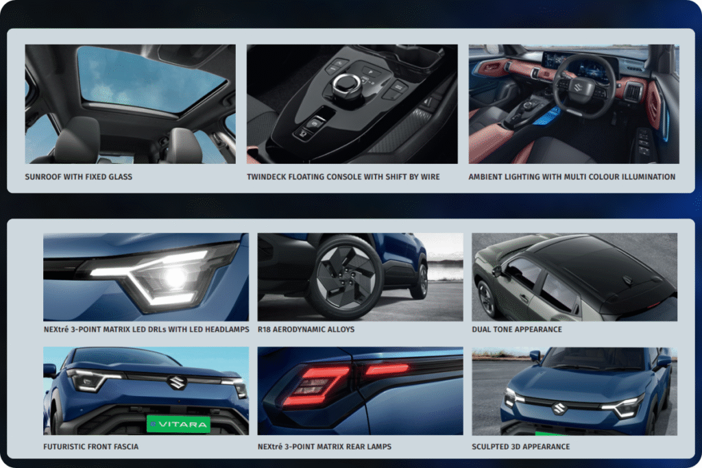 Maruti Suzuki ने अपनी पहली e-Vitara Electric SUV को पेश किया है, जो Pure Electric Platform पर बनी है। इस कार का डिज़ाइन बेहद एरोडायनामिक और मस्क्युलर है, जो न सिर्फ आकर्षक ही नहीं बल्कि परफॉर्मेंस और एफिशिएंसी को भी बढ़ाता है।