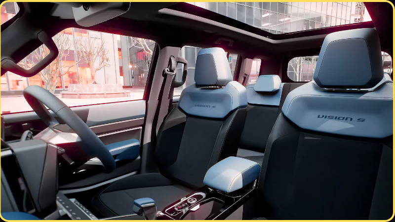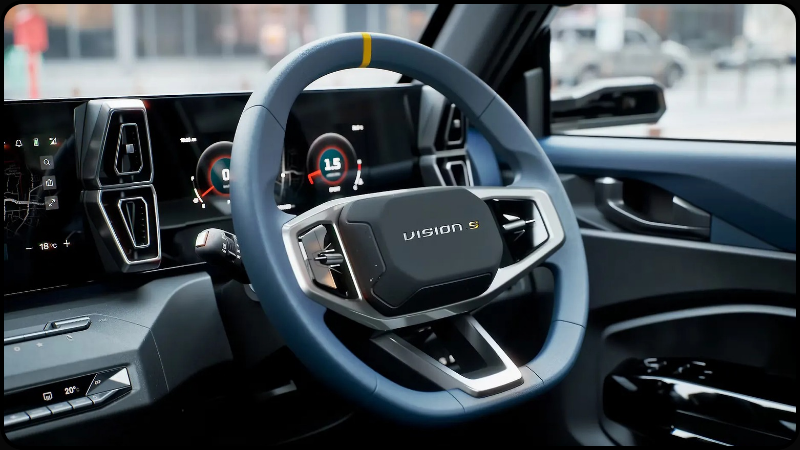 Vision S Concept का केबिन बेहद फ्यूचरिस्टिक है:ब्लू और ब्लैक थीम इंटीरियरसिल्वर-फिनिश डैशबोर्डनया फ्लैट-बॉटम स्टीयरिंग व्हीलड्यूल डिजिटल डिस्प्ले (इंस्ट्रूमेंट + इंफोटेनमेंट)वर्टिकल AC वेंट्सप्रीमियम बटन और येलो इनसर्ट्सवायरलेस Android Auto और Apple CarPlay
