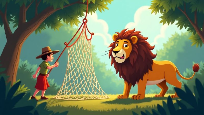 कुछ दिनों बाद शेर जंगल में घूम रहा था। अचानक शिकारी ने उसे जाल में फँसा लिया। शेर गरजता रहा, लेकिन जाल इतना मज़बूत था कि वह निकल नहीं सका।