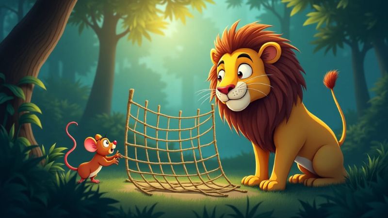 शेर की दहाड़ सुनकर वही छोटा चूहा वहाँ आया। उसने तुरंत अपने दाँतों से जाल काटना शुरू किया और थोड़ी ही देर में शेर आज़ाद हो गया।