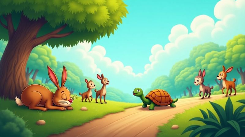 एक बार की बात है, जंगल में एक खरगोश और एक कछुआ रहते थे। खरगोश बहुत तेज़ दौड़ सकता था और उसे अपनी गति पर बड़ा घमंड था। वह अक्सर कछुए का मज़ाक उड़ाता और कहता –